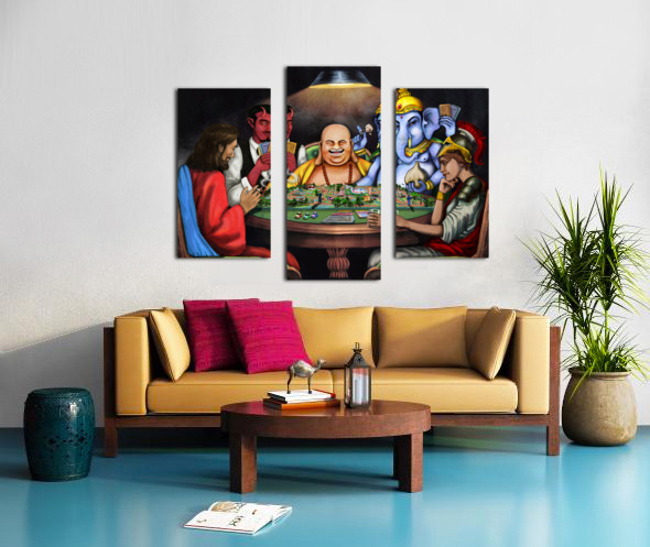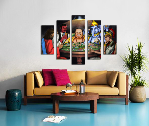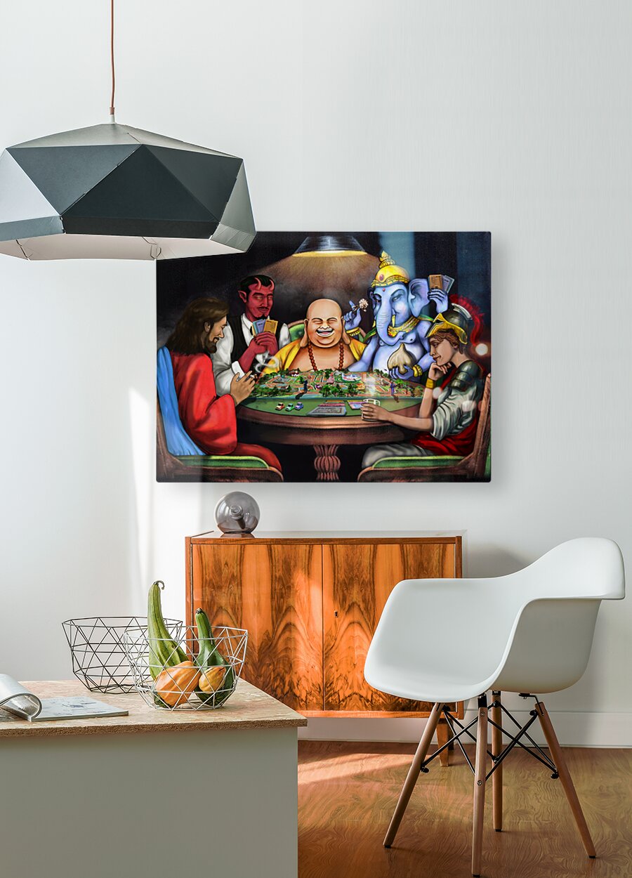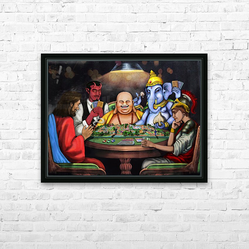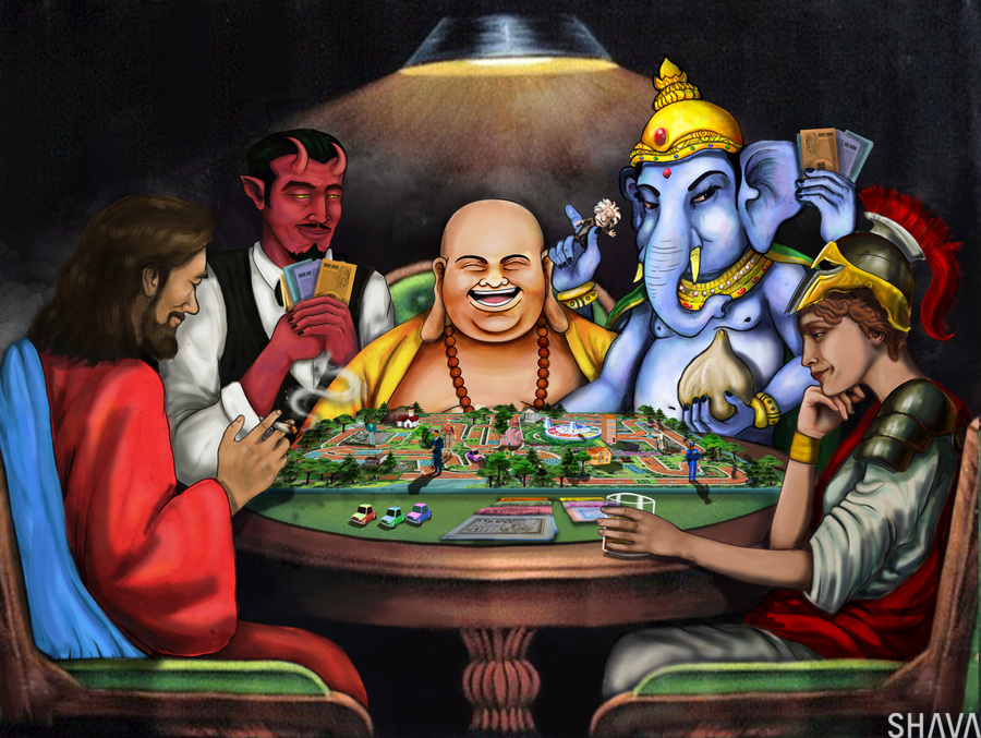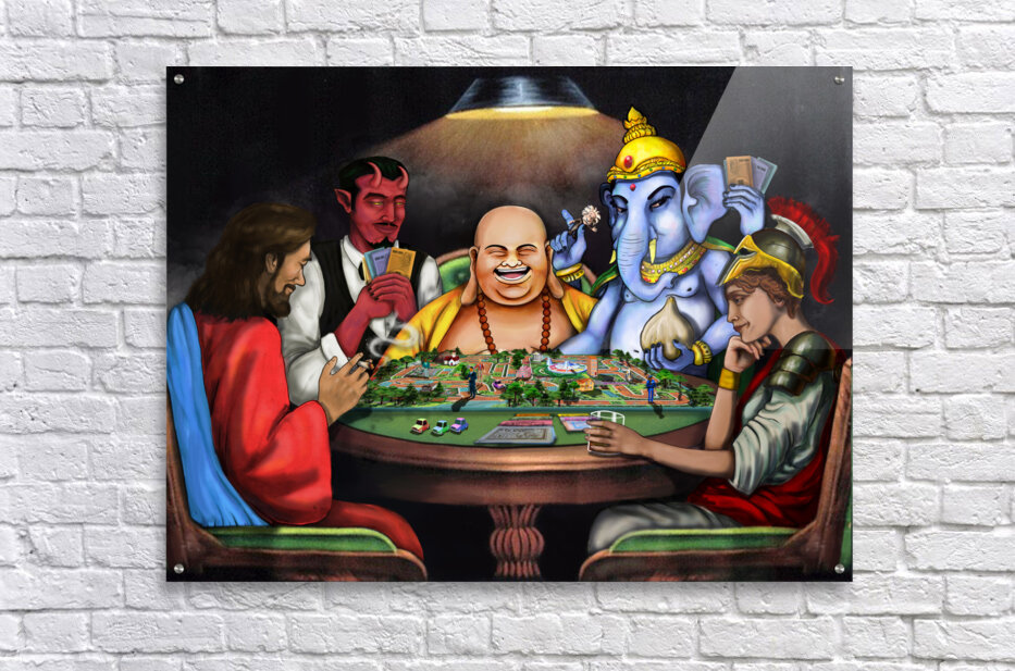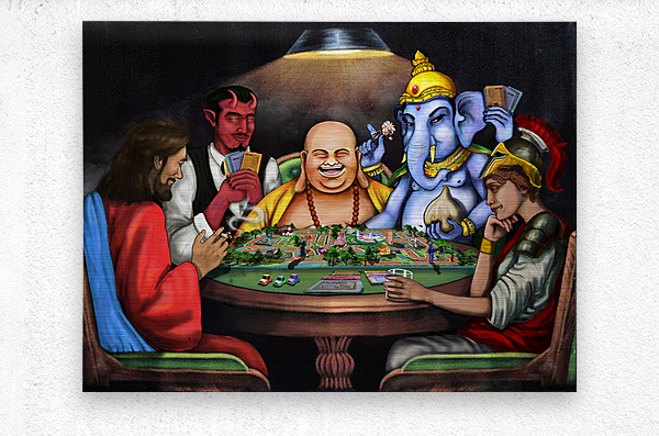 This piece depicts a thought-provoking scene where figures like Jesus, Lucifer, Buddha, Ganesha, and Athena are engaged in a game symbolizing life. Th...[+]